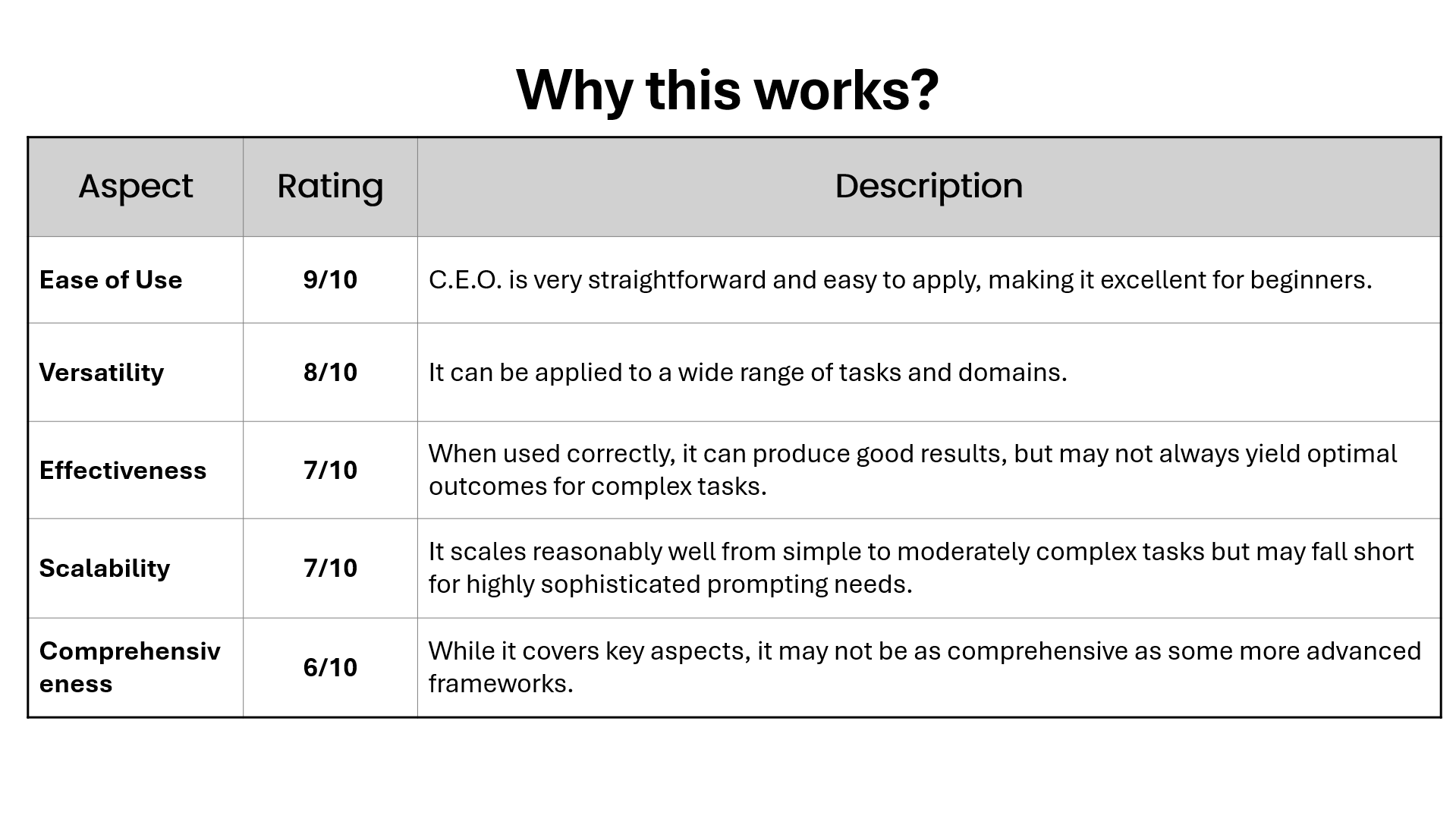 With the C.E.O. Prompting Approach , your prompt responses will be clearer, and more precise. Try this and let me know how did it go.