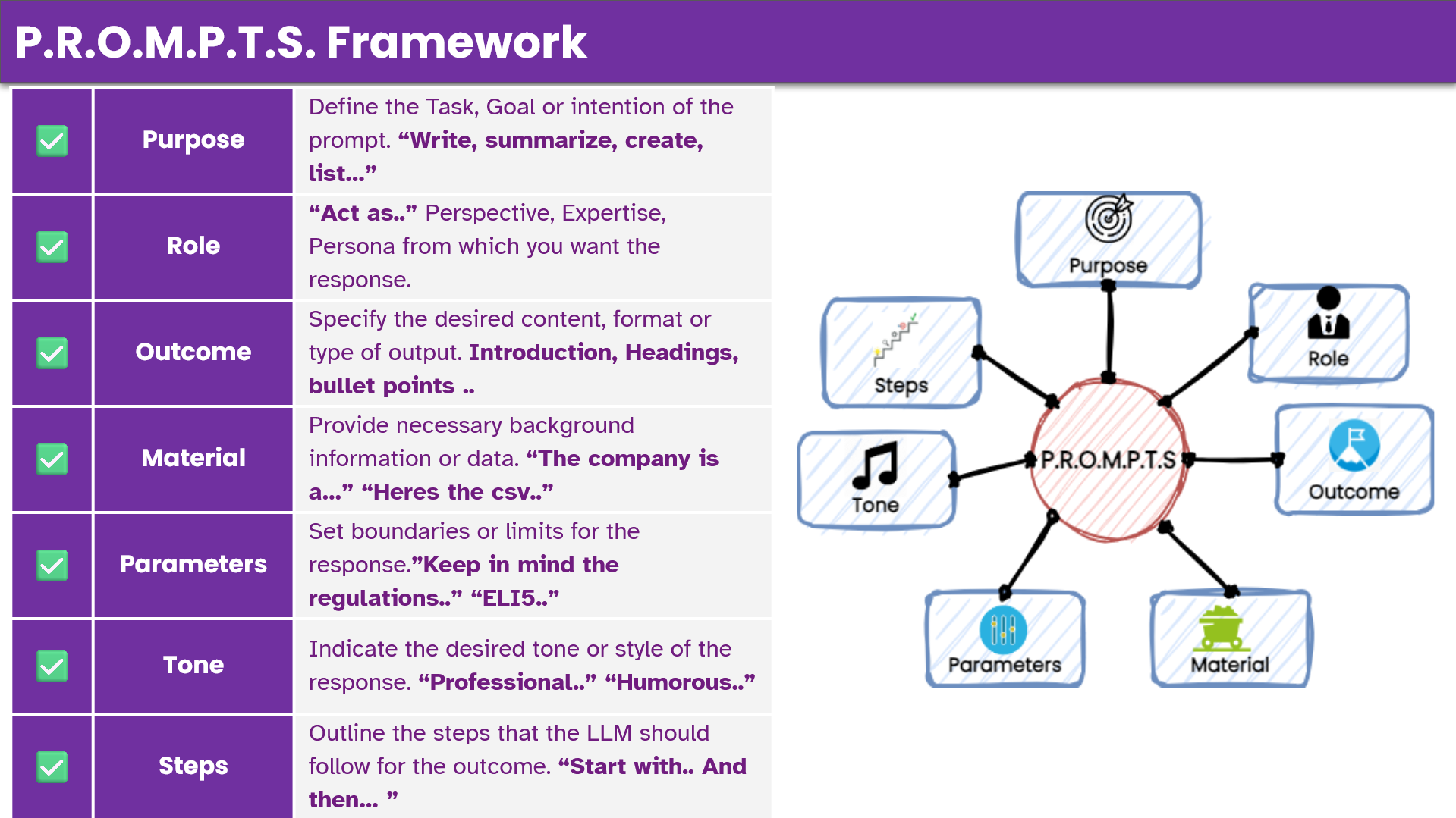 Let us introduce the P.R.O.M.P.T.S. Framework, an advanced, structured approach that ensures your prompts are clear, comprehensive, and designed to deliver exceptional results.